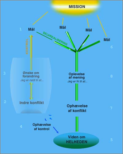 En holistisk målsætning Et mål, der sættes i almindelig dagsbevidsthed (1), vil være underlagt vores uløste konflikter (2), som tvinger os til forandring (3). Et sådant mål vil være som en afskåret blomst – der må "kunstvanding" til i form af konstant viljestyrke, for at det ikke skal visne. I en holistisk målsætning afdækker vi først konflikten og slipper den (4) for at skabe kontakt til den indre viden om helheden, som konflikten spærrede for (5). Herfra udspringer mål og delmål spontant (6), og idet stresstilstanden ophæves (7), kan du slappe af, så du er fri til at følge dit mål, ikke tvunget til det (8). Energien bliver afslappet og kreativ, fordi målene har "kontakt med rødderne" – de næres af din naturlige længsel efter at realisere dig selv. For